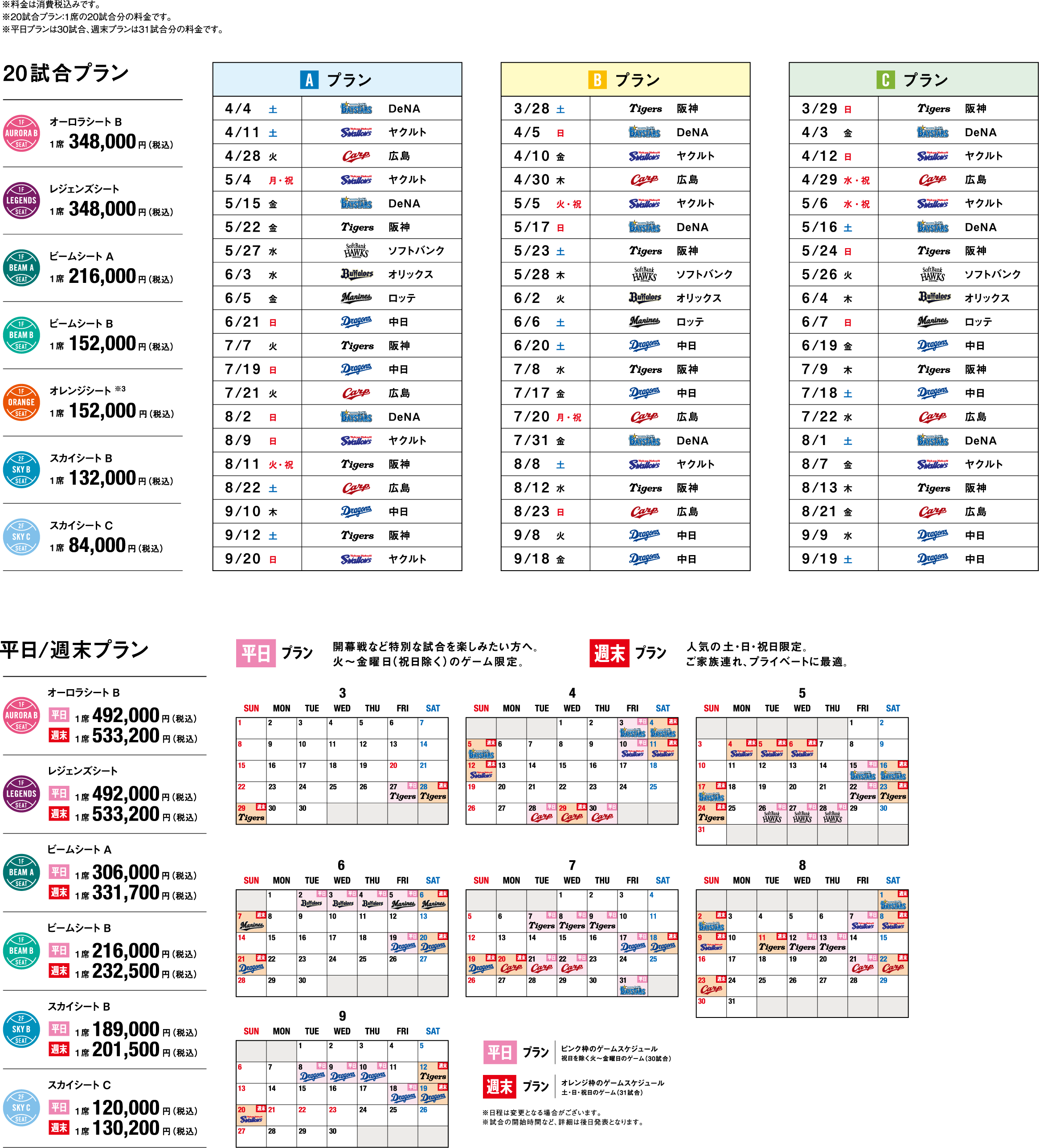主催64試合から対戦カード・曜日をバリエーション豊かに組み合わせた20試合をピックアップ。7種類の席種、3種類の日程プラン(A/B/C)からお選びいただけます。※2026年は「シーズンシート パック10(10試合プラン)」の販売はありません。予めご了承ください。